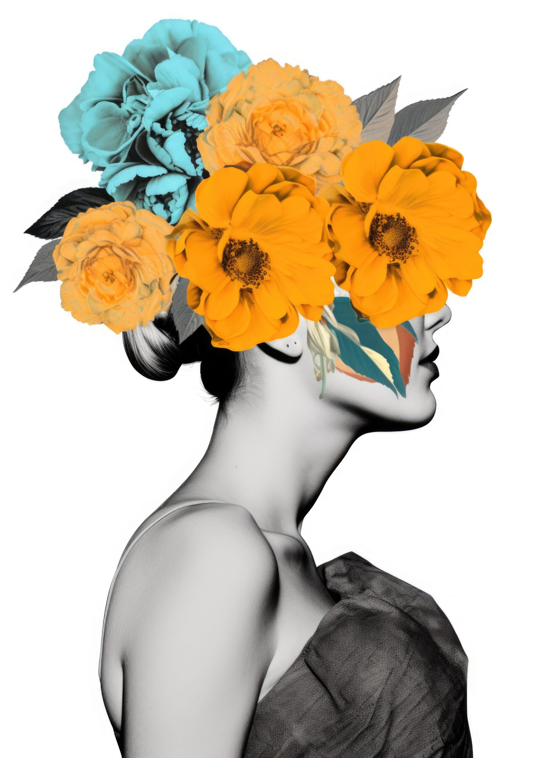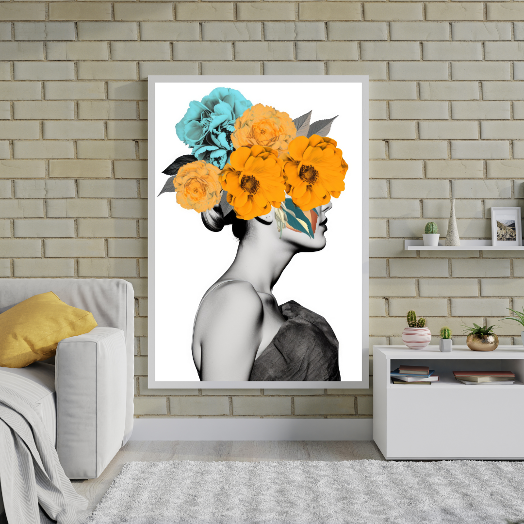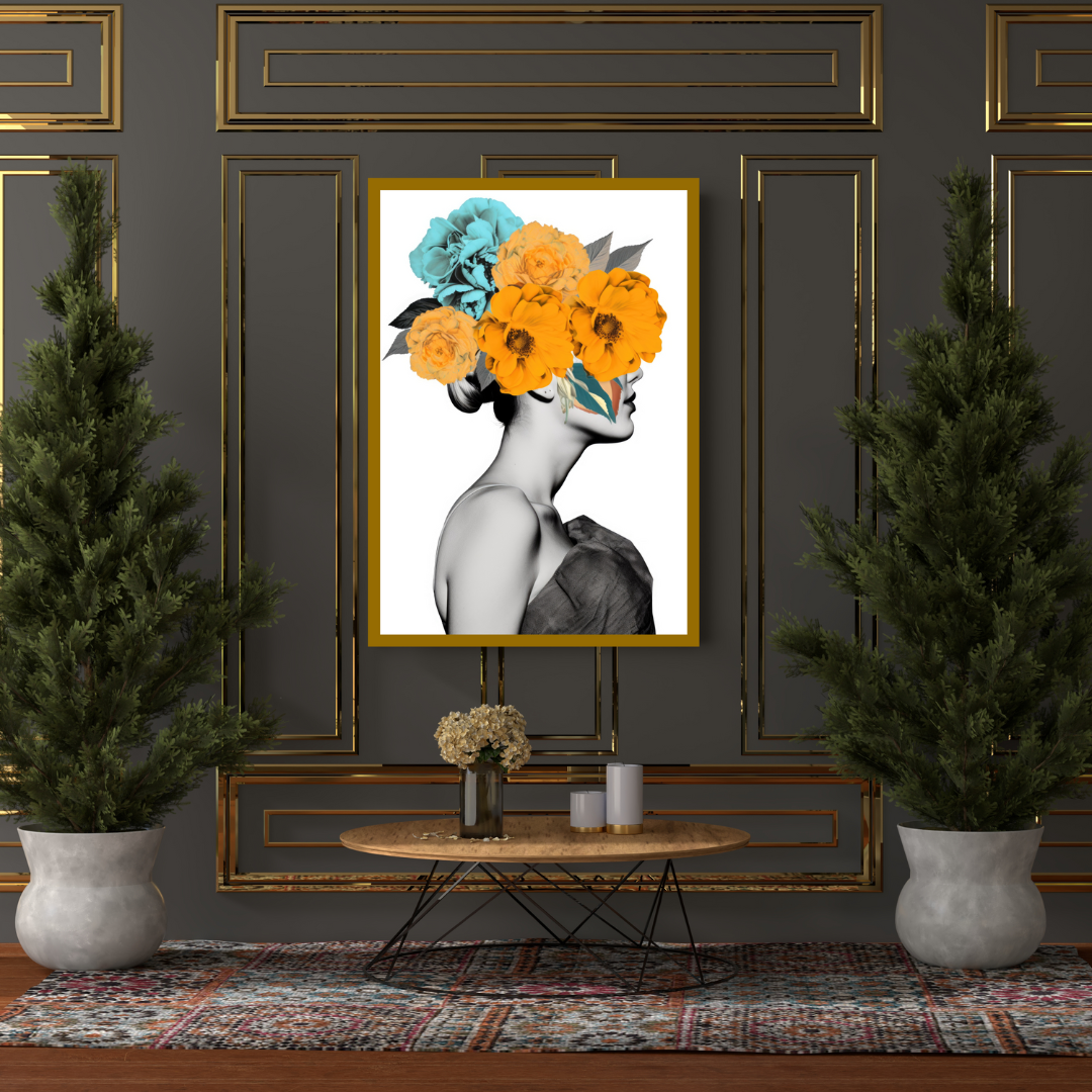 Luxury Botanical Portrait Art in Yellow and Aqua Tones
