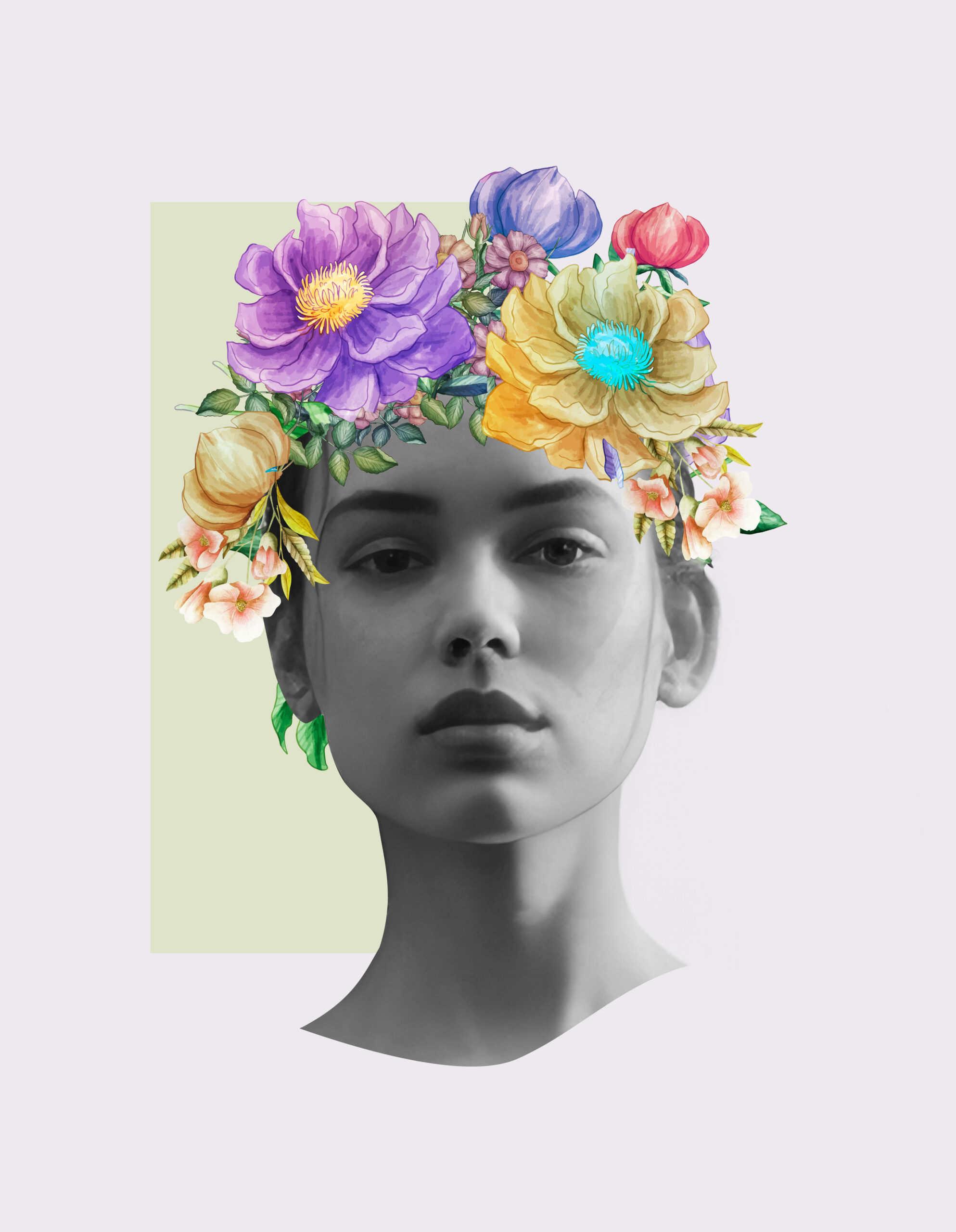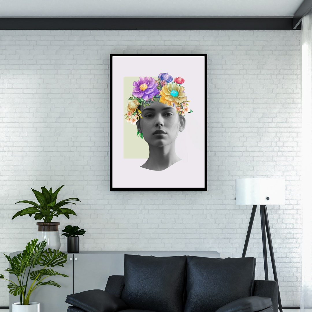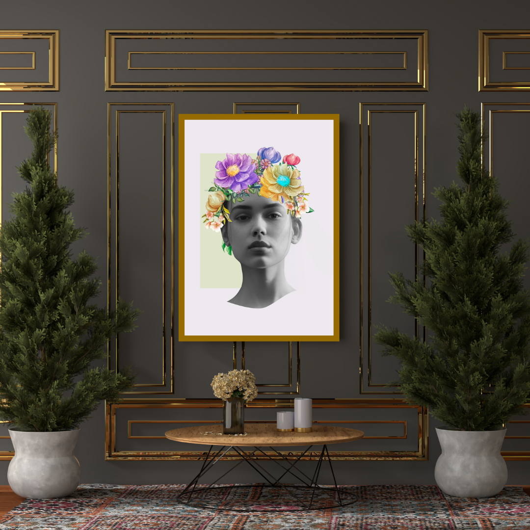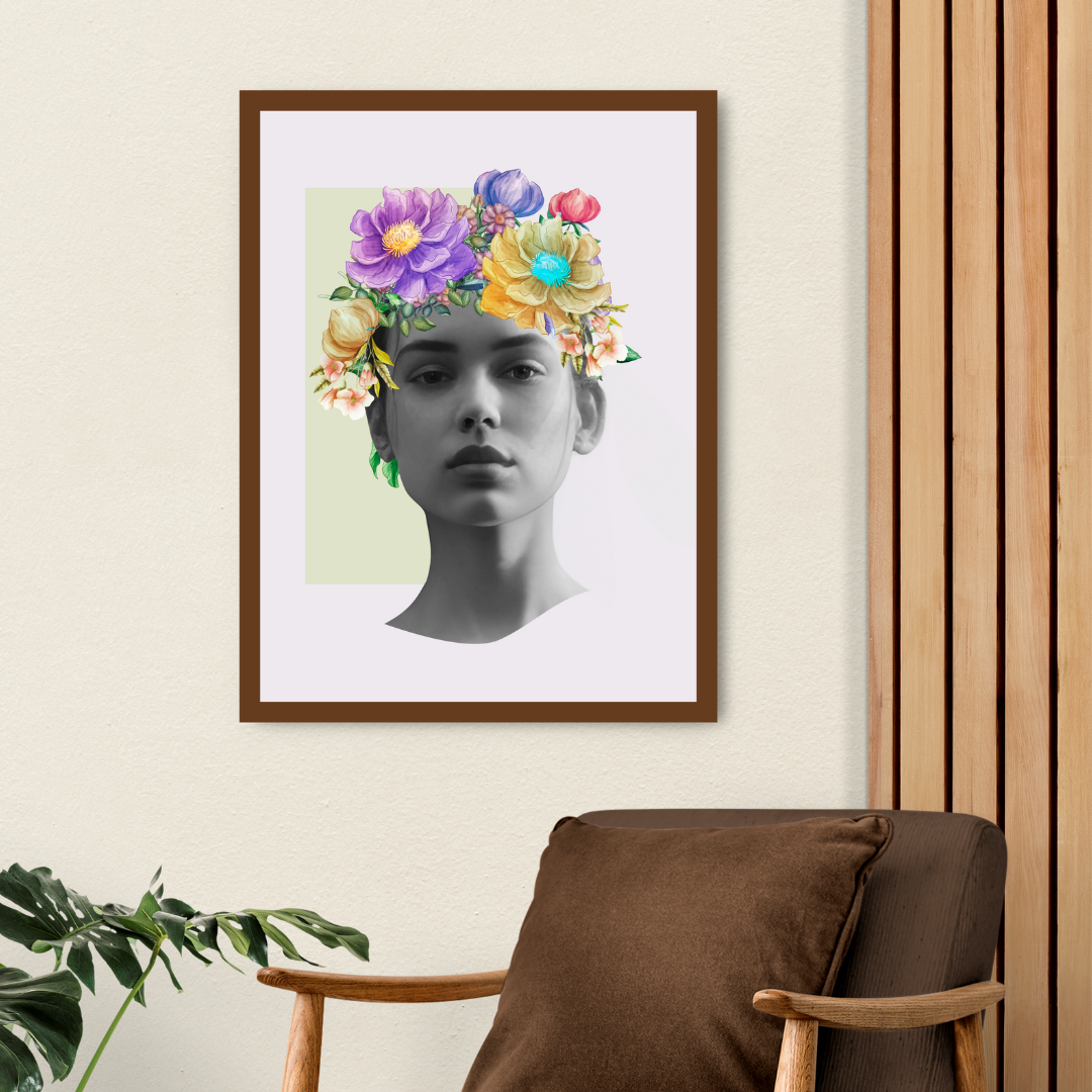 Surreal Floral Portrait Art with Colorful Flower Crown
