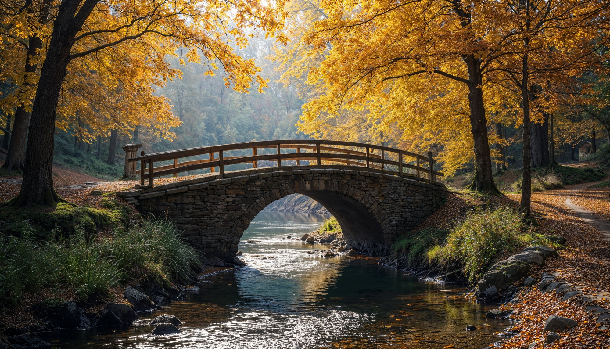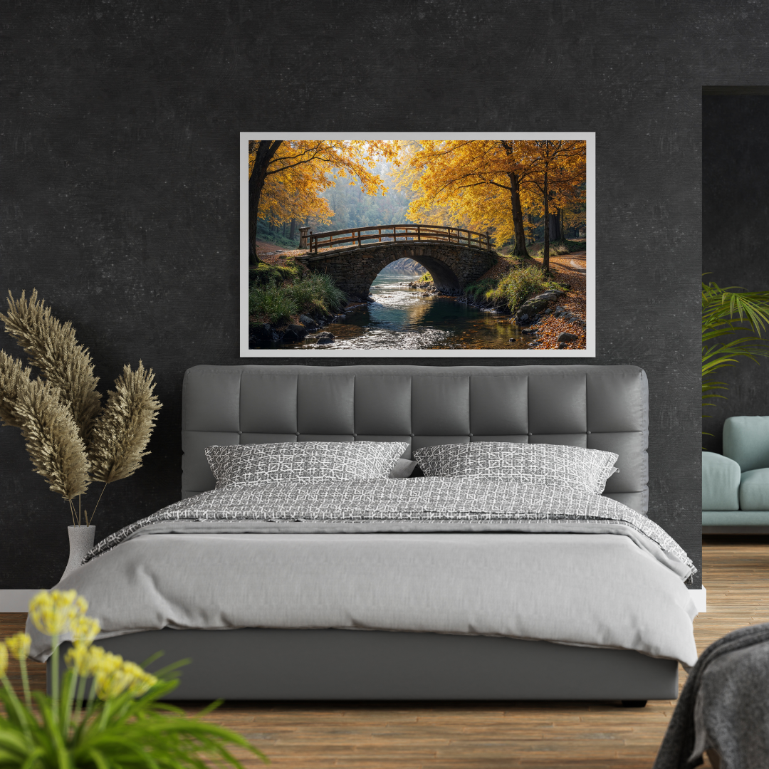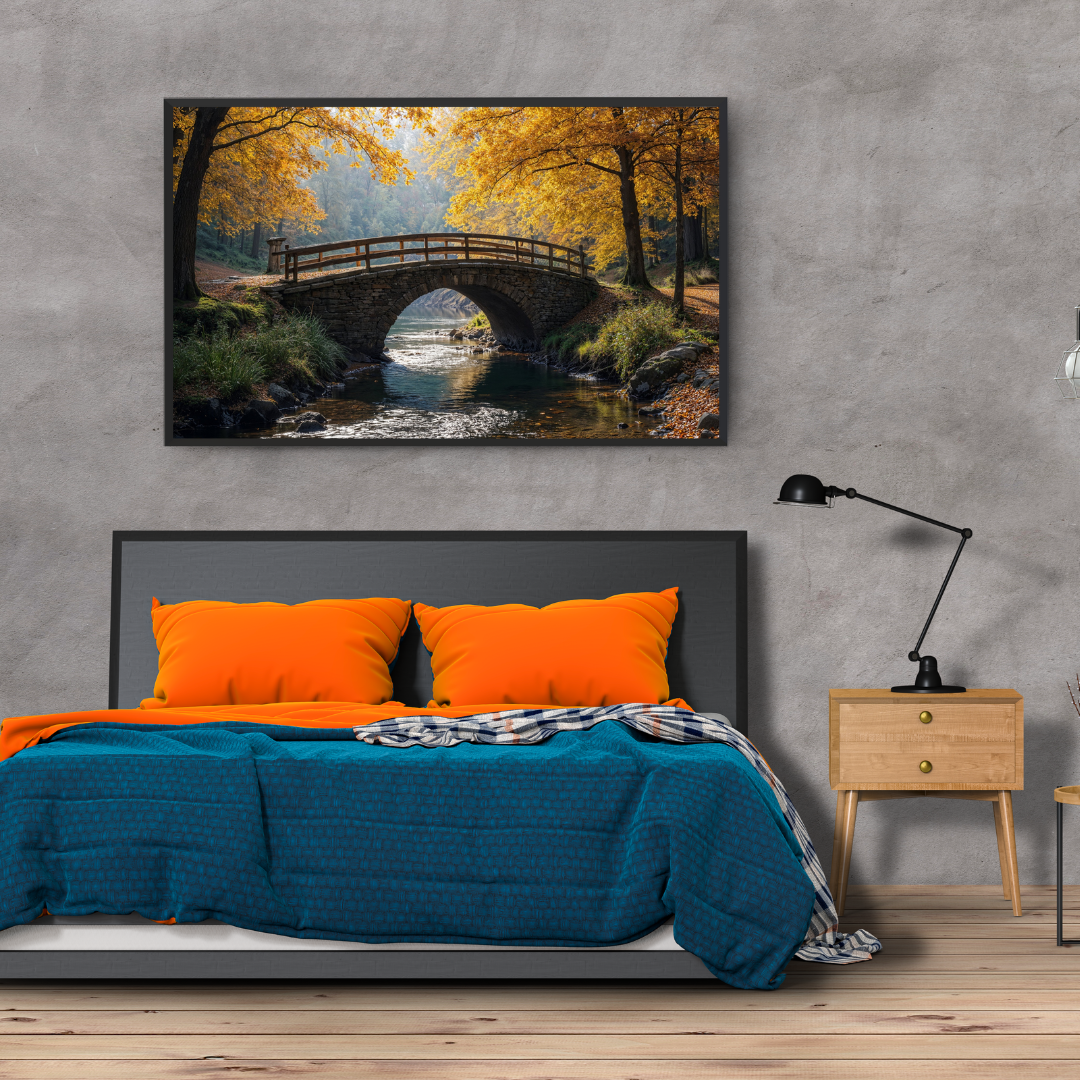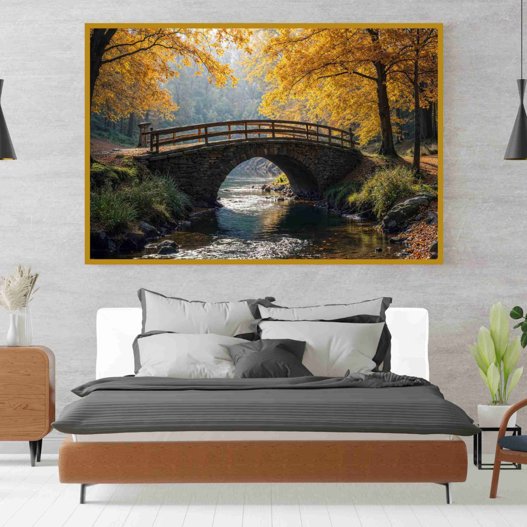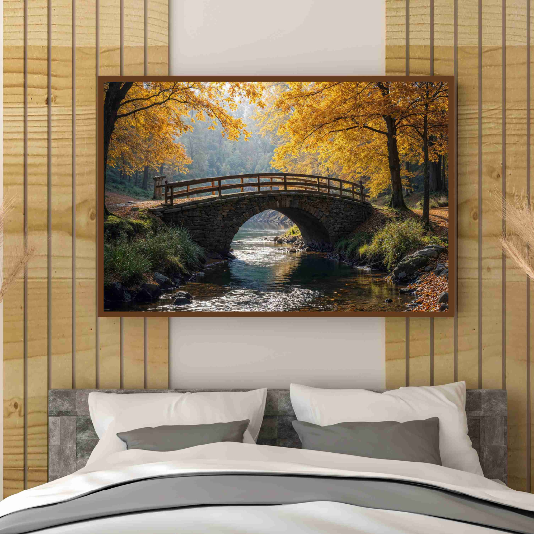 Autumn Forest Bridge Landscape Painting Frame with Stream View