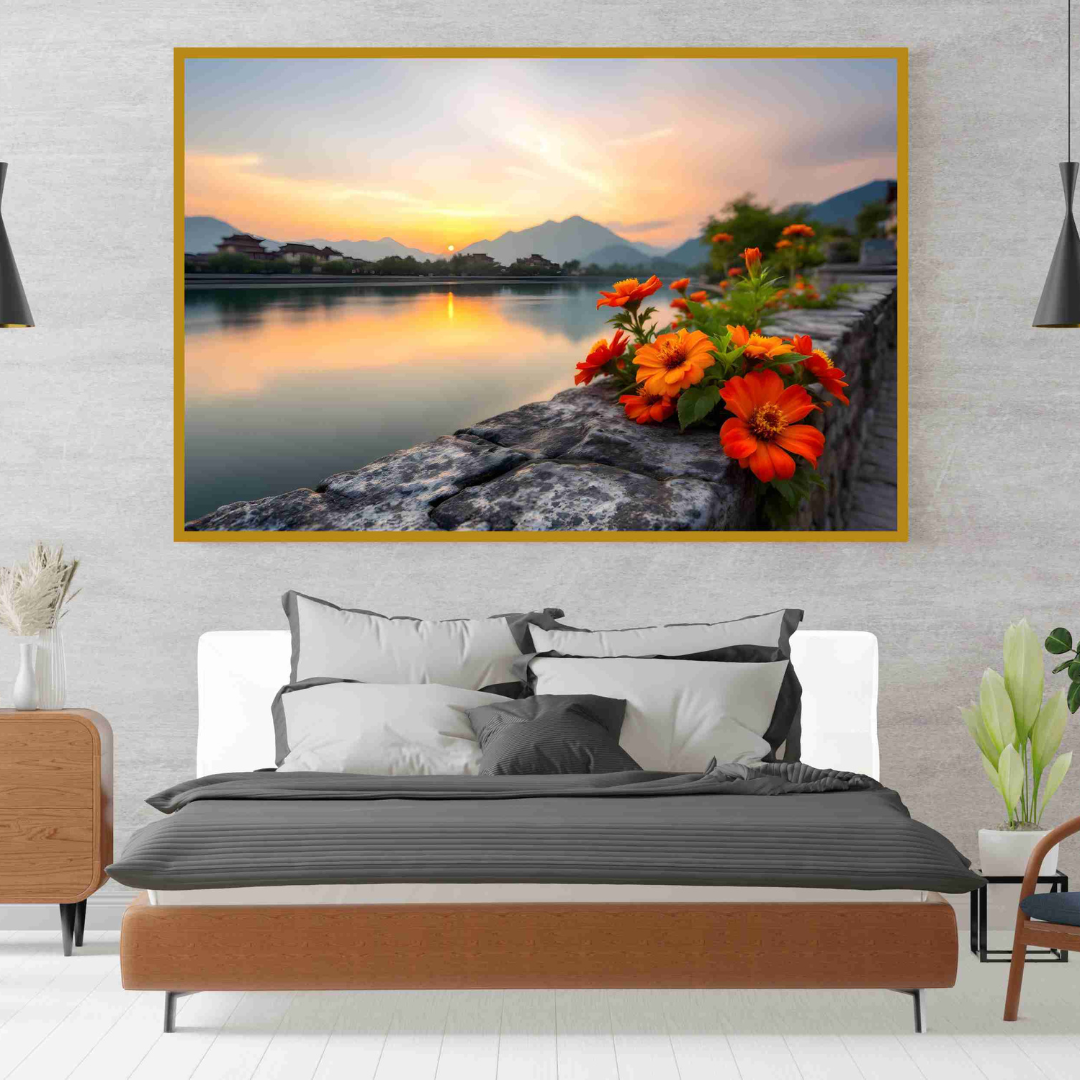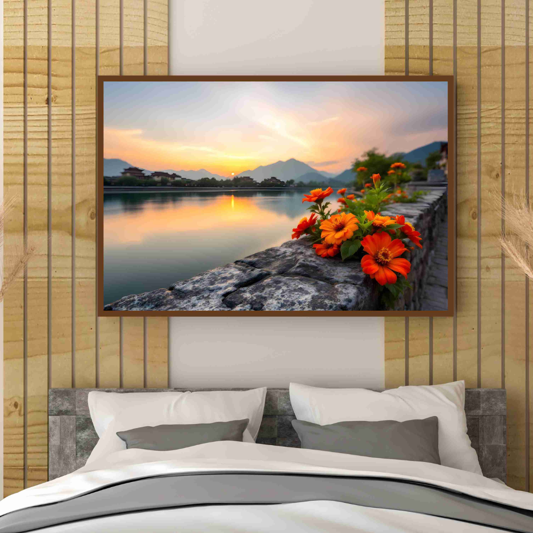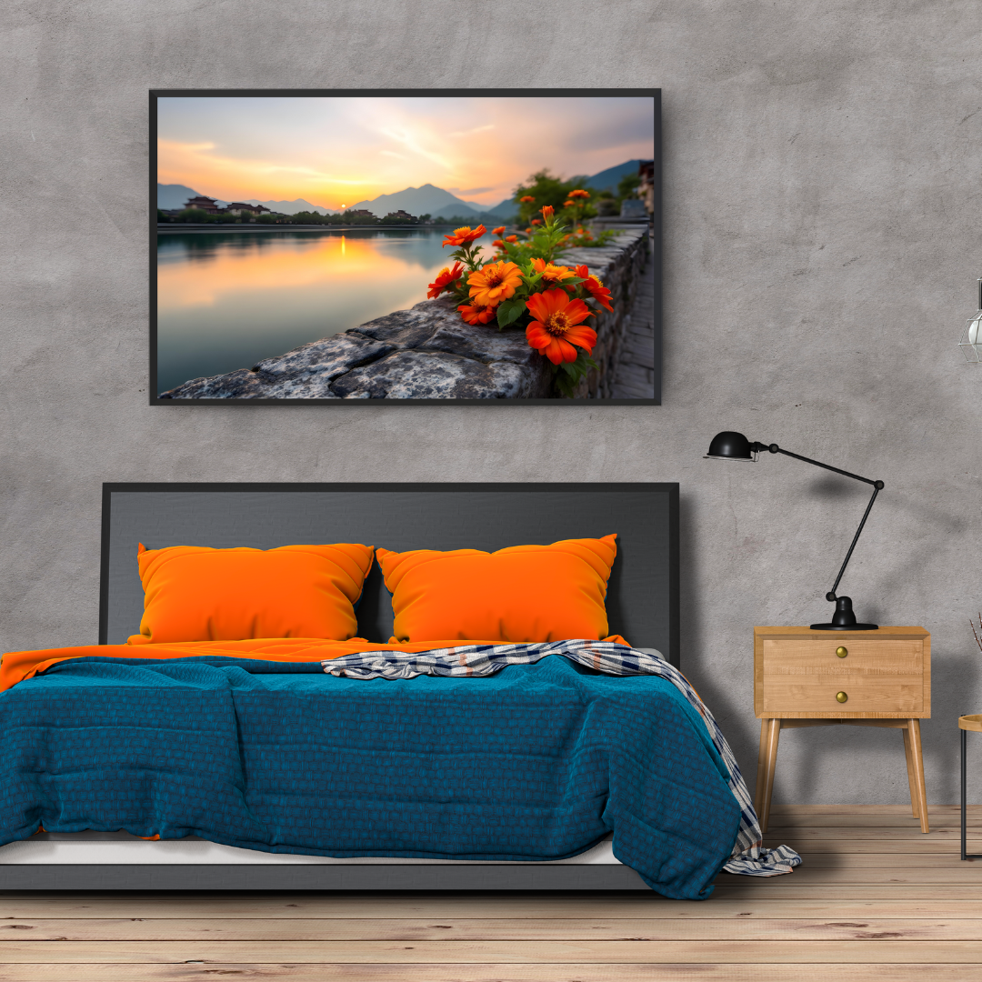 Serene Sunset Lake Landscape with Orange Flowers Wall Art Frame