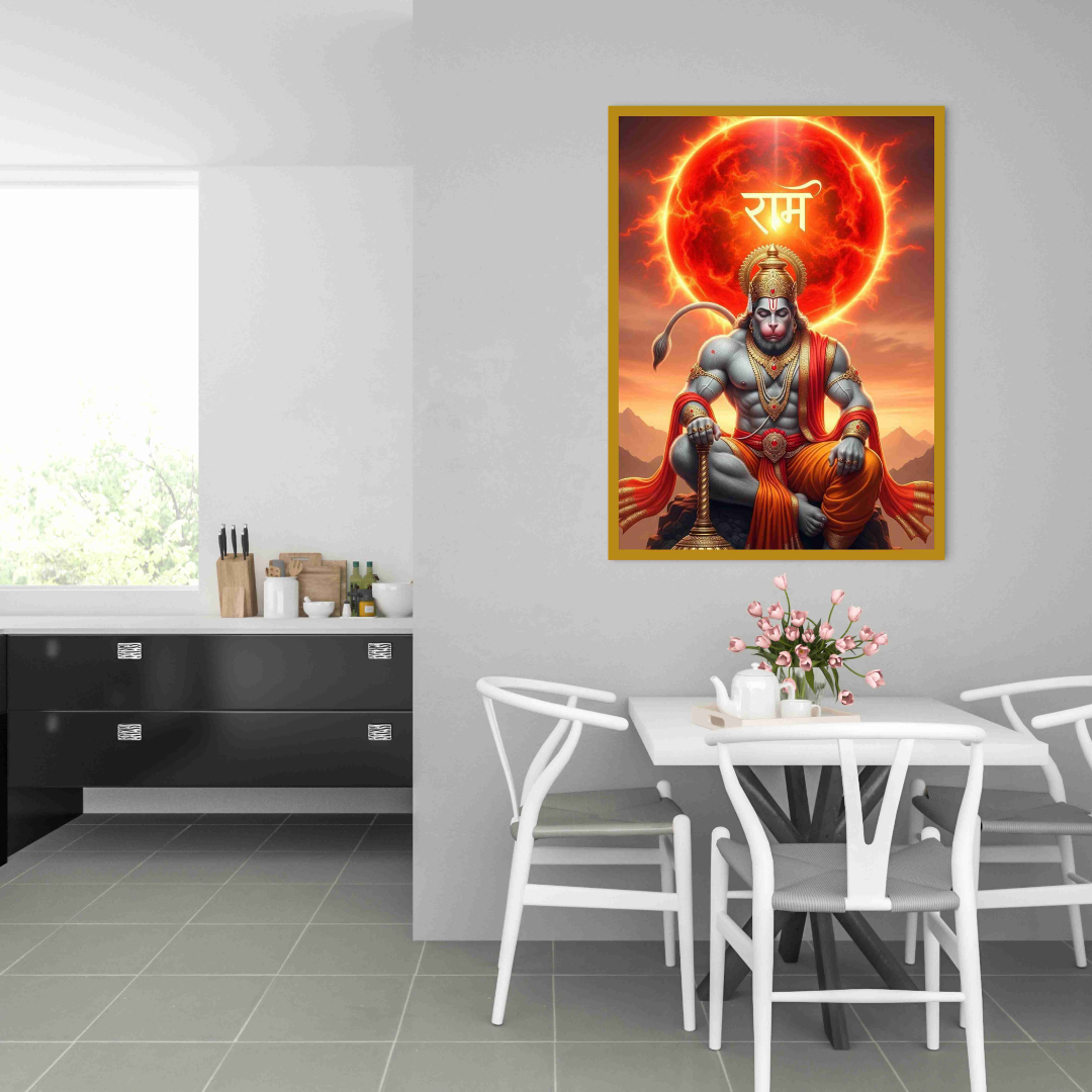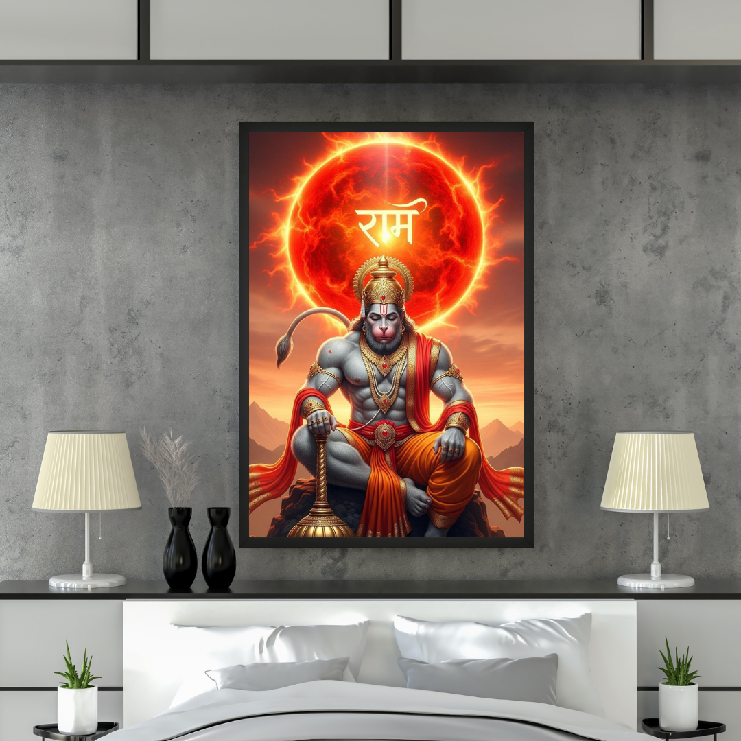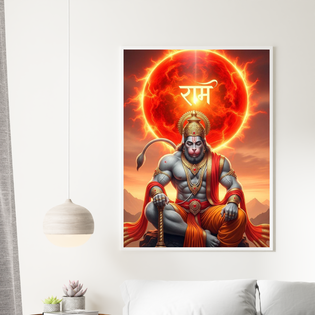 Divine Lord Hanuman Artwork. Powerful Sitting Pose with Radiant Sun Background