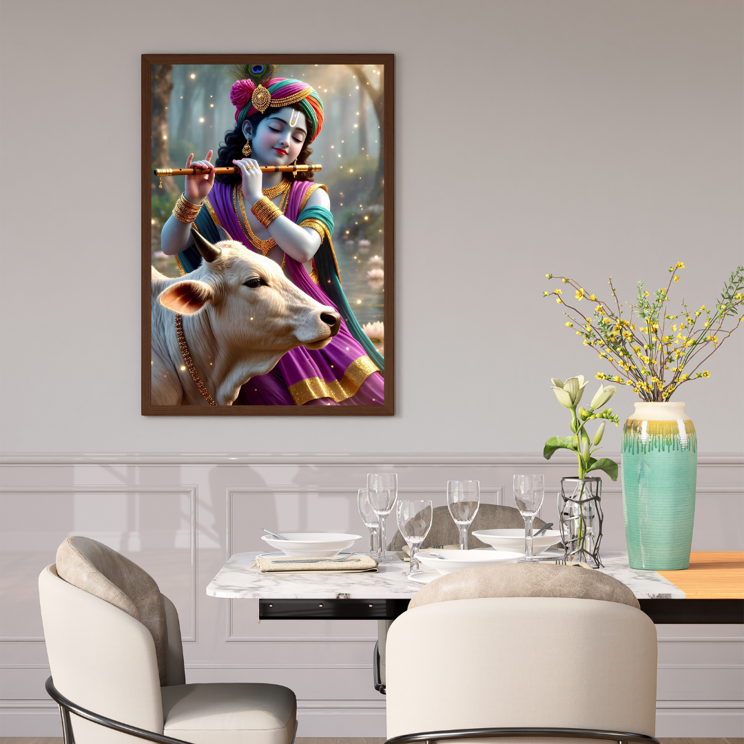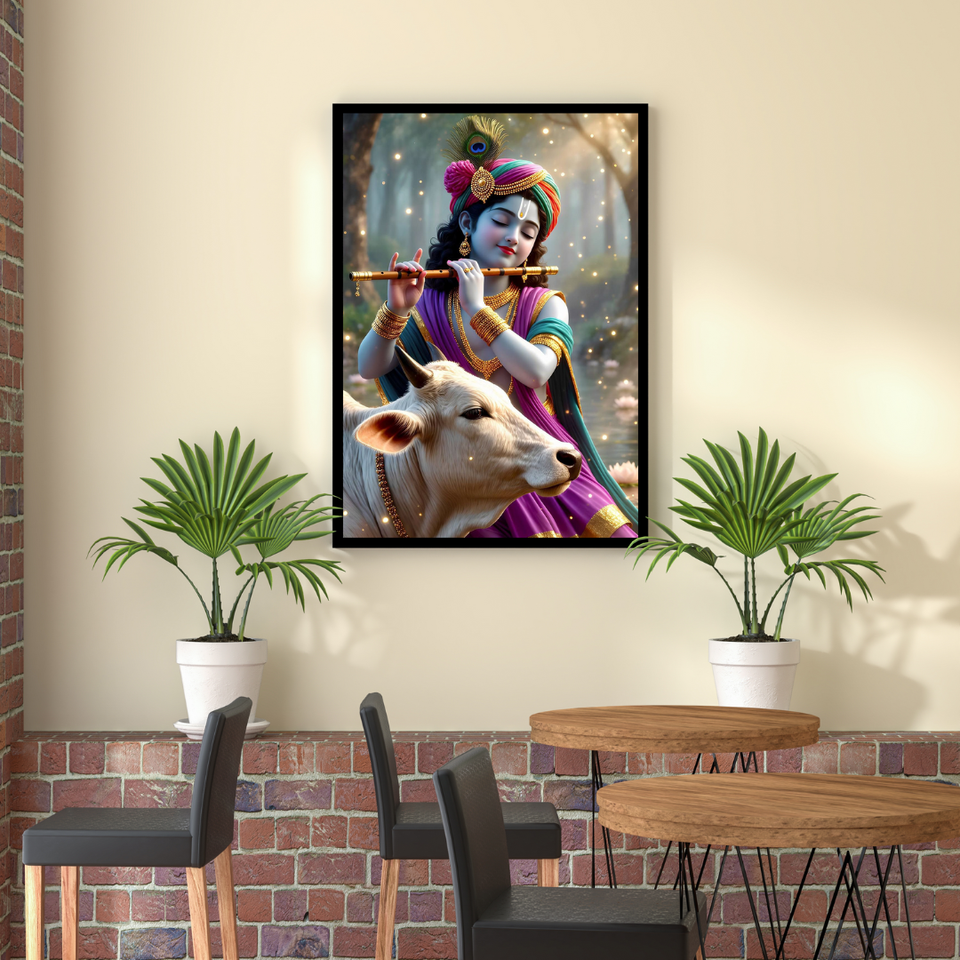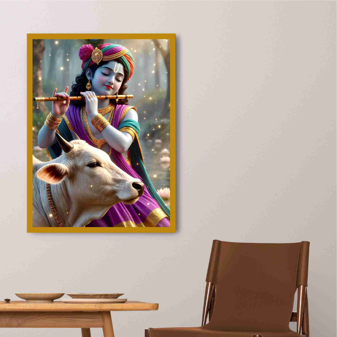 Lord Krishna Playing Flute with Cow