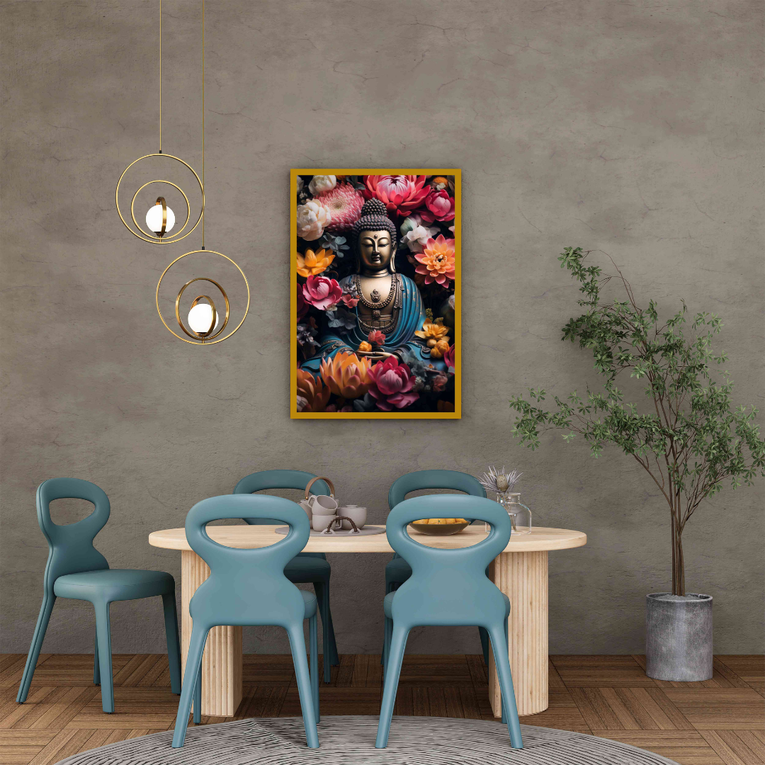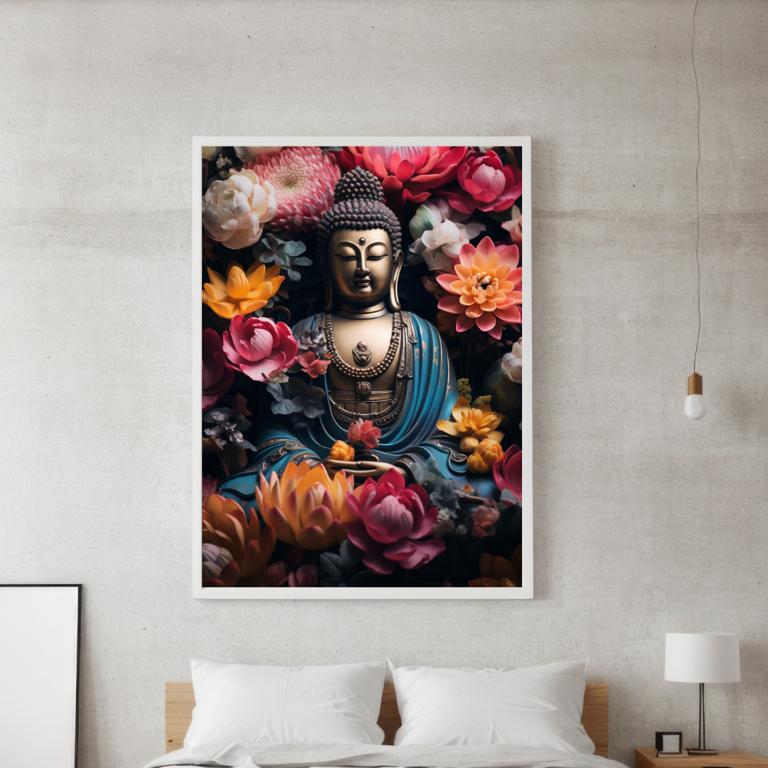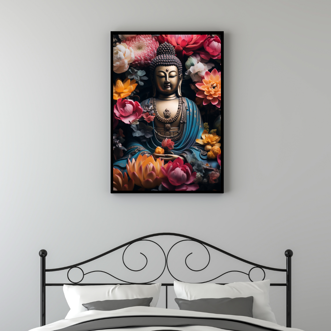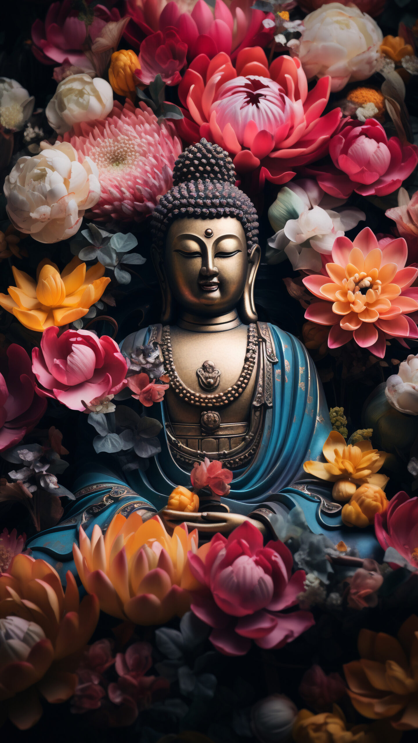 Beautiful Buddha Statue with Colorful Flowers – Peaceful Spiritual Home Decor Art