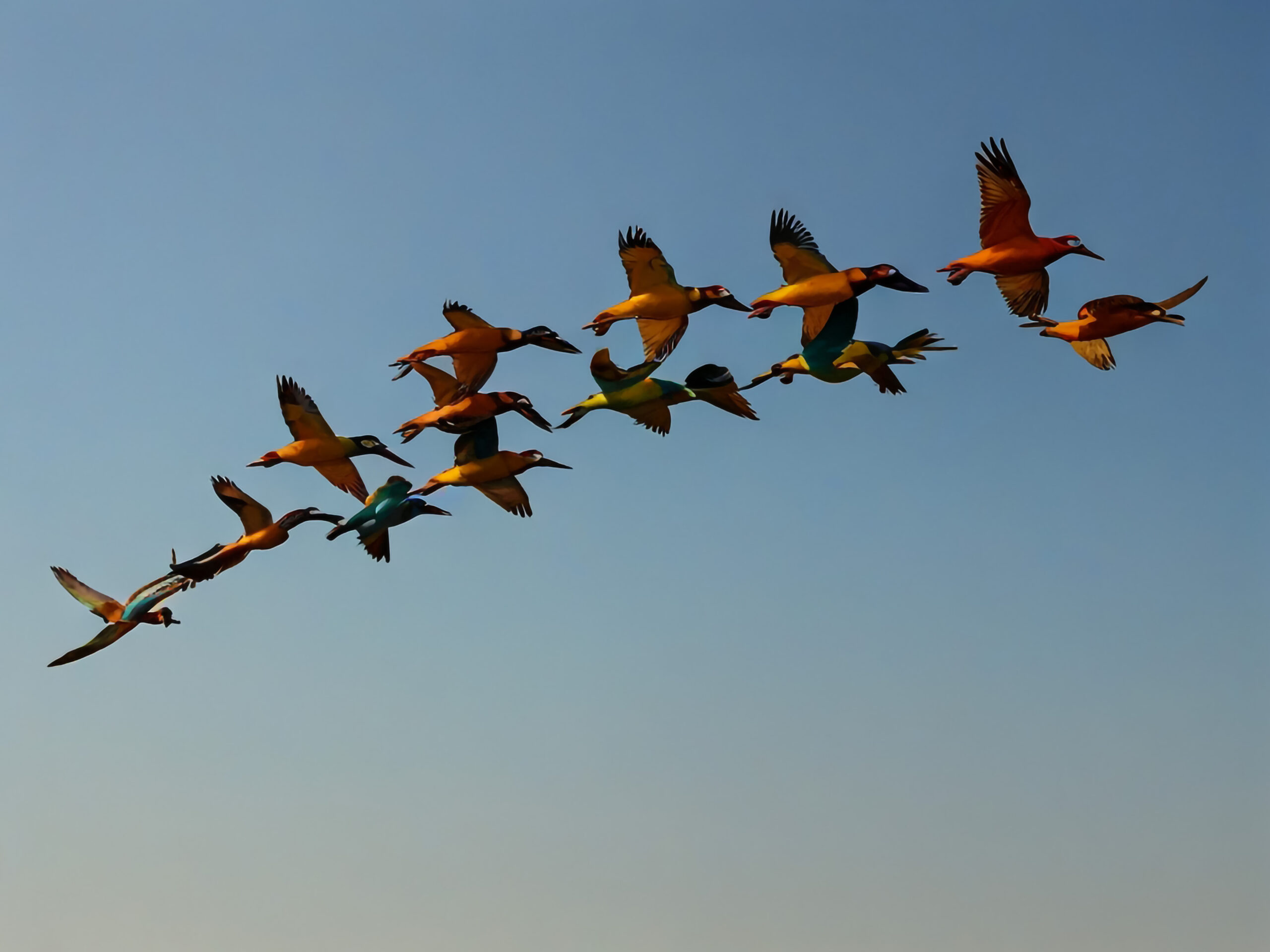 flock birds flying line with sky background